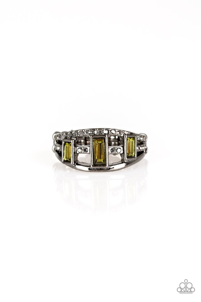 Three green emerald-cut rhinestones are encrusted along three gunmetal bands radiating with smooth surfaces and sections of glittery hematite rhinestones for an edgy fashion. Features a stretchy band for a flexible fit.