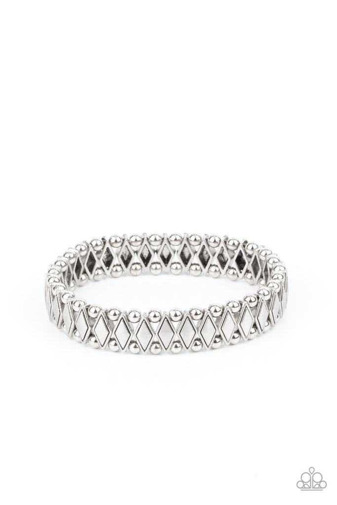 Brushed in an antiqued shimmer, pairs of dainty silver beads flank diamond shaped silver beads along stretchy bands around the wrist for a rustic fashion.