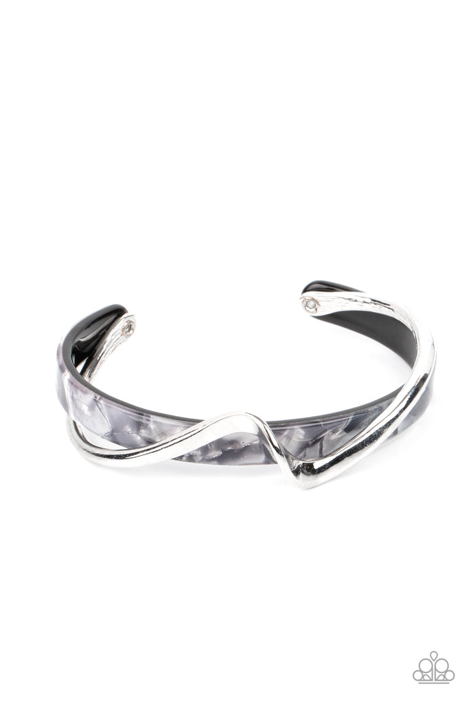 A flat silver bar delicately curls across a dainty gray shell-like acrylic cuff, creating a whimsical centerpiece around the wrist.