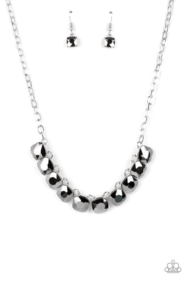 A succession of gleaming radiant cut hematite gems attaches to a silver chain and falls below the collar for an edgy show-stopping display. Features an adjustable clasp closure.