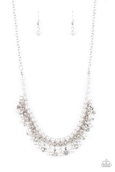 A Touch of CLASSY Silver Necklace: Infused with silver chain, silver pearls are threaded along an invisible wire below the collar. Matching silver pearls and glittery white rhinestones swing from the pearly strand, creating a flirtatious fringe below the collar. Features an adjustable clasp closure.