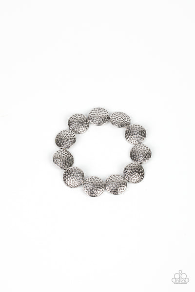 Hammered in antiqued details, a rustic collection of silver beads are threaded along a stretchy band around the wrist for a wildly adventurous look.