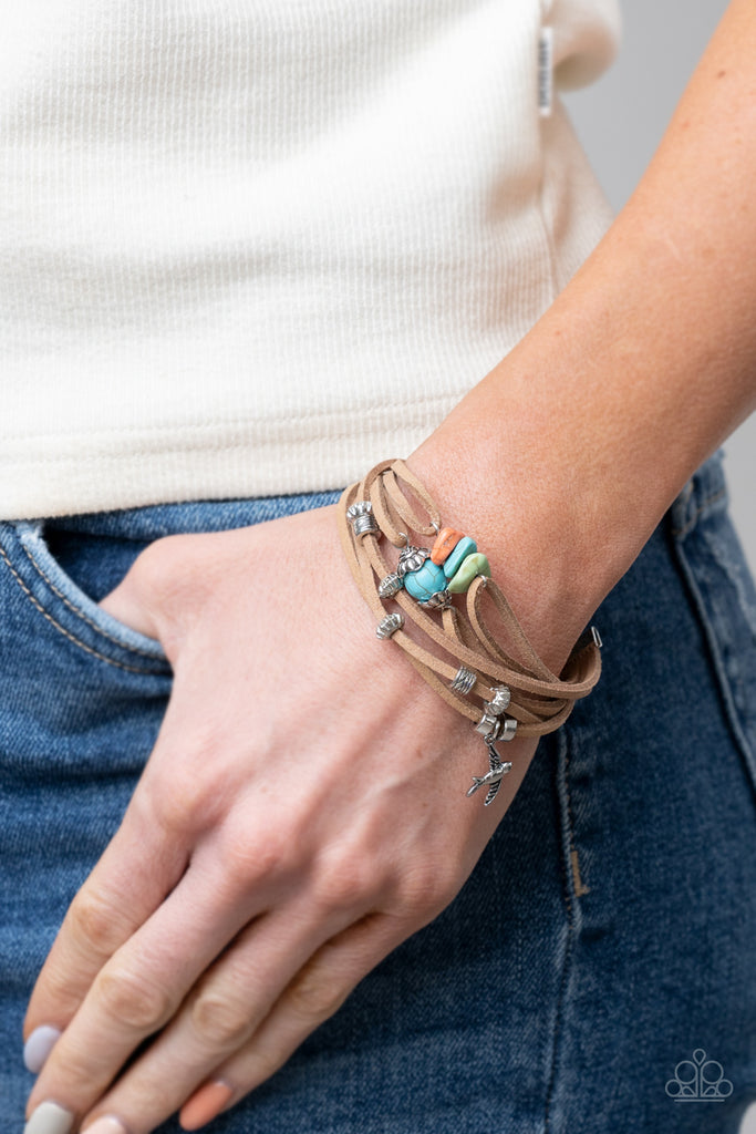 Infused with a dainty silver bird charm, dainty strands of brown suede are adorned in mismatched silver accents and multicolored stones for a colorfully layered look. Features an adjustable clasp closure.
