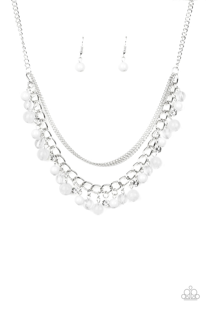 Infused with layers of mismatched silver chains, glassy, polished white, and glittery white rhinestones swing from the bottom of a bold silver chain, creating a bubbly fringe below the collar. Features an adjustable clasp closure.