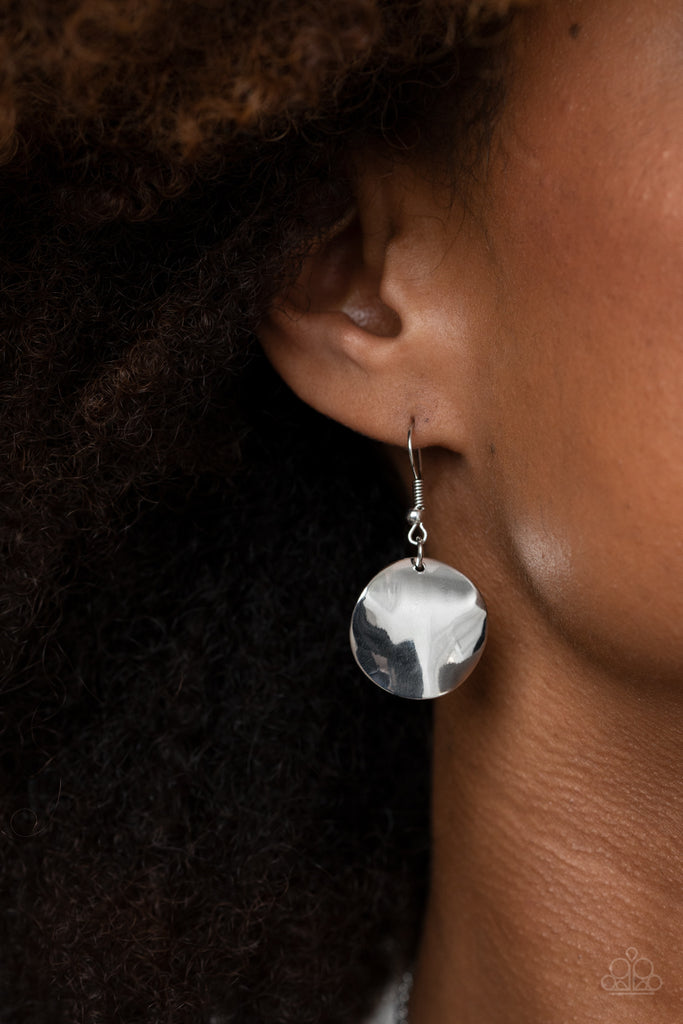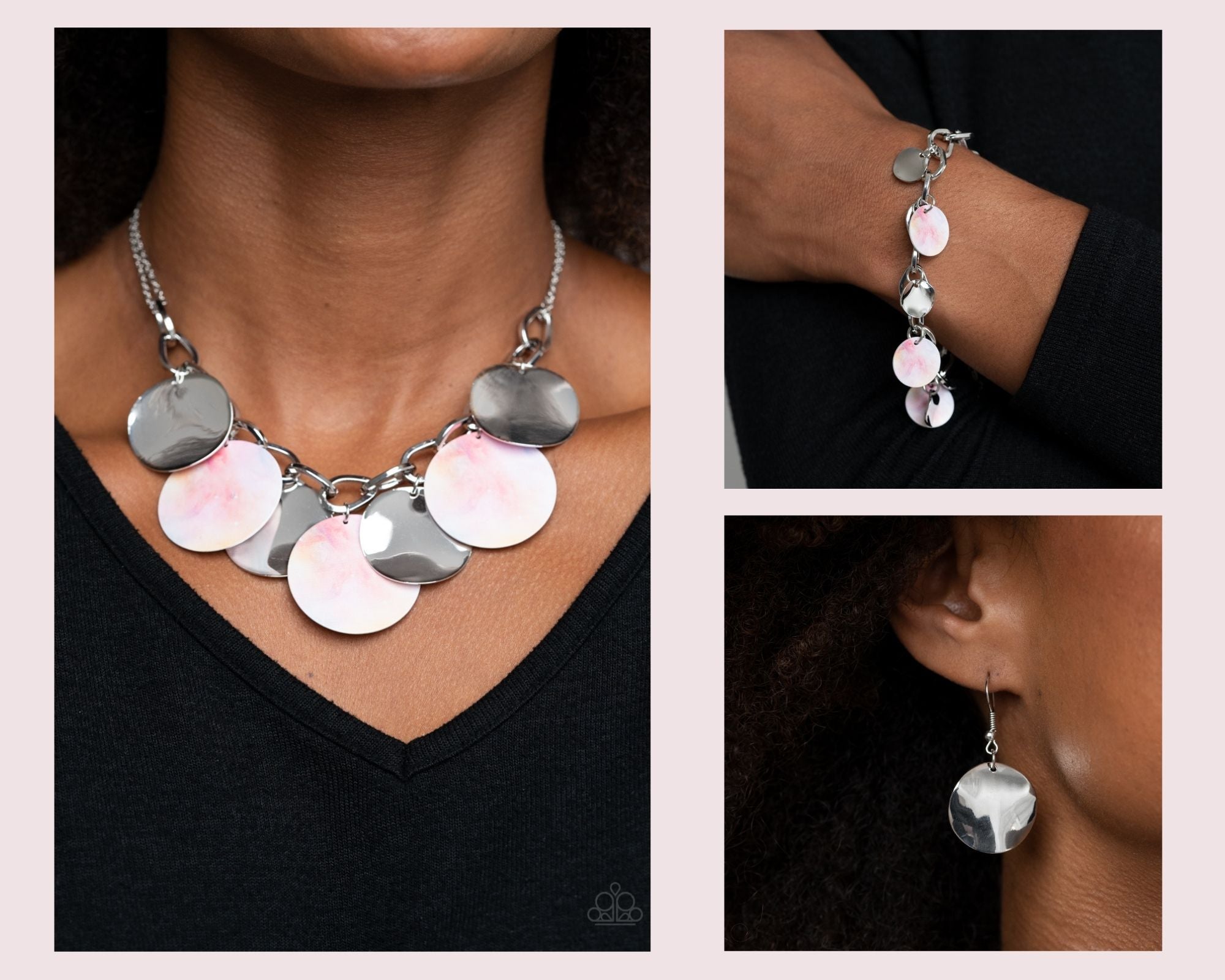 Tie Dye Drama Multi Necklace: Featuring a galactic tie dye print, flat colorful discs swirled in tones of pink and yellow combine with curved silver discs, swinging from the bottom of a bulky silver chain for a trendy throwback look. Features an adjustable clasp closure.