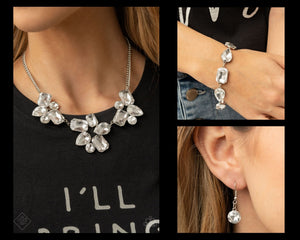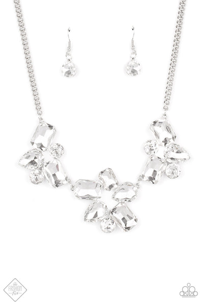 Galactic Goddess White Necklace: An unexpected explosion of oversized round, teardrop, and emerald cut rhinestones cluster into haphazard groupings. The blinding clusters link together, creating a stellar statement piece that sits below the collar. Features an adjustable clasp closure.