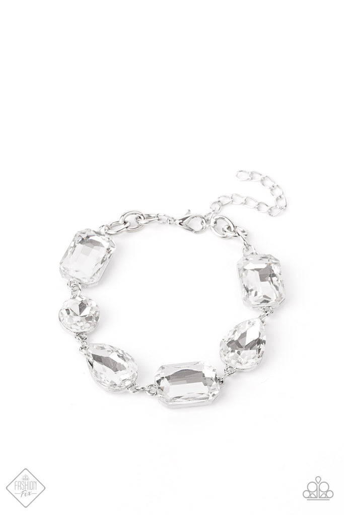 Cosmic Treasure Chest White Bracelet: A collection of oversized round, teardrop, and emerald cut rhinestones delicately link around the wrist, creating a blinding statement piece. Features an adjustable clasp closure.