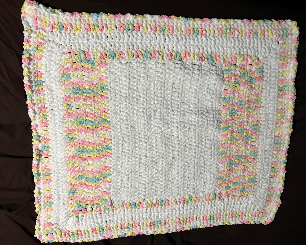 Pink, yellow, white and blue hand-made crocheted baby blanket
