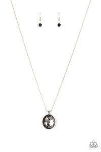 An oversized smoky gem is pressed into the center of a sleek silver fitting, creating a mesmerizing statement piece at the bottom of a sleek silver chain. Features an adjustable clasp closure.