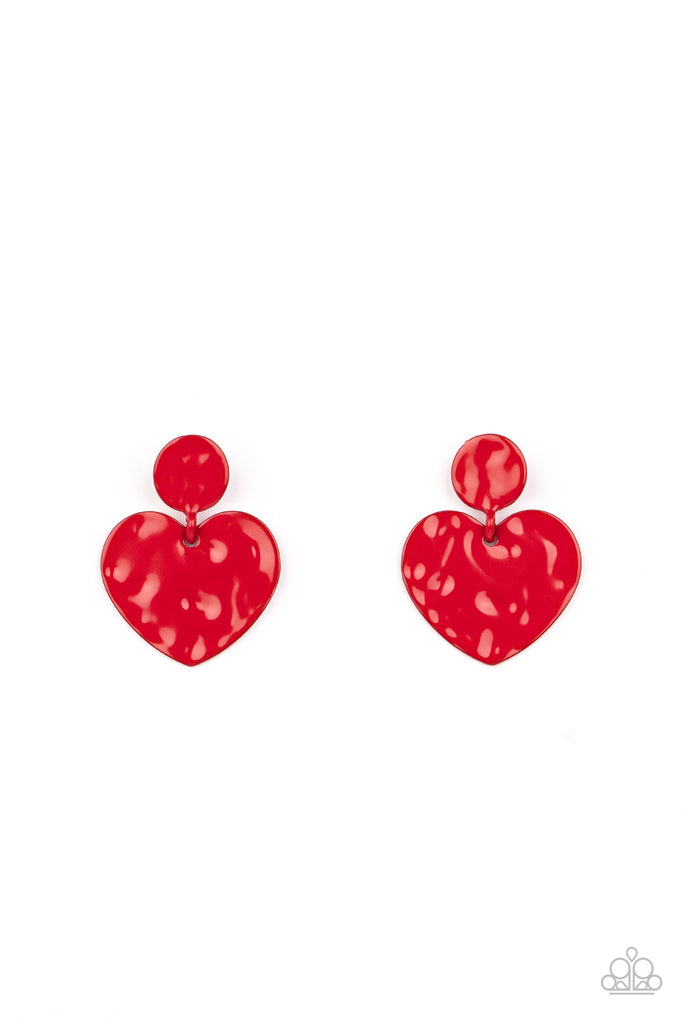 Painted in a glossy red finish, a hammered disc gives way to a hammered heart frame for a flirtatious fashion. Earring attaches to a standard post fitting.