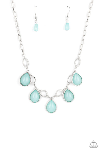 Encased in sleek silver frames, opaque Blue Tint teardrop beads link with dainty white rhinestone encrusted silver ovals below the collar, creating a mystical fringe. Features an adjustable clasp closure.