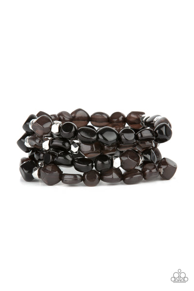 Glossy black irregular shaped beads in varying opacities, accented with shining faceted silver beads are threaded along stretchy bands and stack up the wrist for a glowing display.