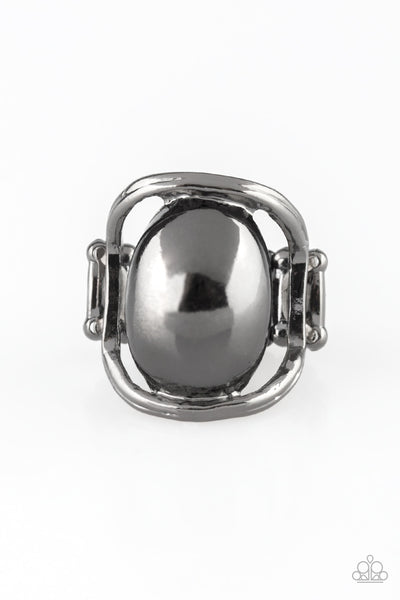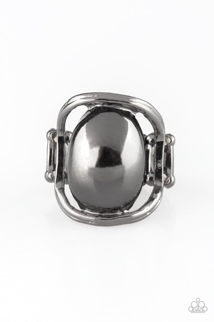 Glistening gunmetal frames curl around a beveled gunmetal disc, creating an edgy frame. Features a stretchy band for a flexible fit.