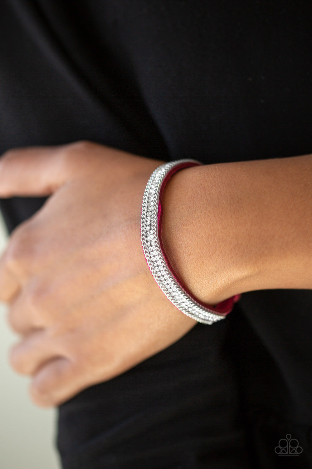 A skinny strand of pink suede is encrusted in rows of glittery white rhinestones and shimmery silver chains for a sassy look. Features an adjustable clasp closure.
