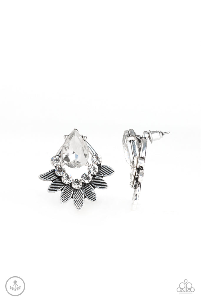 A solitaire white teardrop gem attaches to a double-sided post designed to fasten behind the ear. Dotted in dainty white rhinestones, a leafy silver double-sided frame peeks out beneath the ear for an eye-catching look. Earring attaches to a standard post fitting.