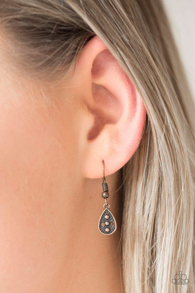Glistening copper rods and ornate teardrops link below the collar in two rows, creating a playful fringe. Features an adjustable clasp closure.