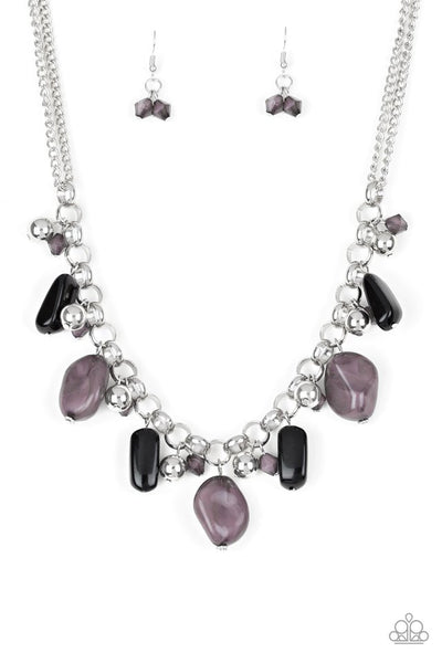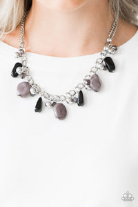 Featuring polished and cloudy finishes, a collection of black faux rocks dance from the bottom of a bold silver chain. Classic silver beads trickle between the colorful beading, adding a metallic shimmer to the whimsical fringe. Features an adjustable clasp closure.