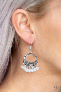 Opaque white crystal-like beads swing from the bottom of a studded round silver frame, creating a twinkling fringe. Earring attaches to a standard fishhook fitting.