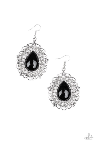 An oversized black teardrop bead is pressed into a swirling silver backdrop encrusted in a dazzling ring of glassy white rhinestones for a glamorous finish. Earring attaches to a standard fishhook fitting.