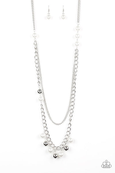 A collection of oversized white pearls gives way to mismatched layers of silver chains down the chest for an asymmetrical look. Dotted with oversized white pearls and shiny silver beads, a matching beaded fringe swings from the bottom of the lowermost chain for a modern twist. Features an adjustable clasp closure.