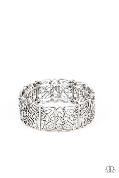 Antiqued silver filigree filled frames are threaded along stretchy bands around the wrist, creating a whimsical centerpiece.