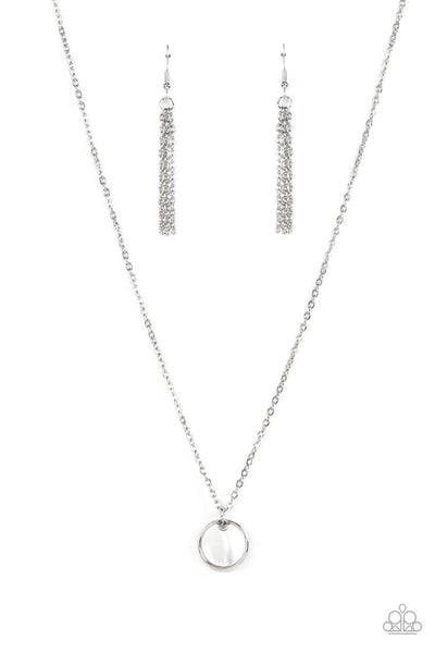 Encased in a sleek silver frame, a white shell-like disc swings from the bottom of a dainty silver chain below the collar for a minimalist inspired fashion. Features an adjustable clasp closure. As the stone elements in this piece are natural, some color variation is normal.