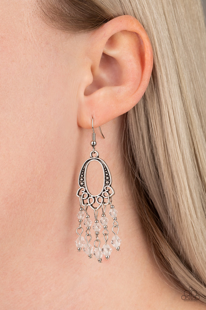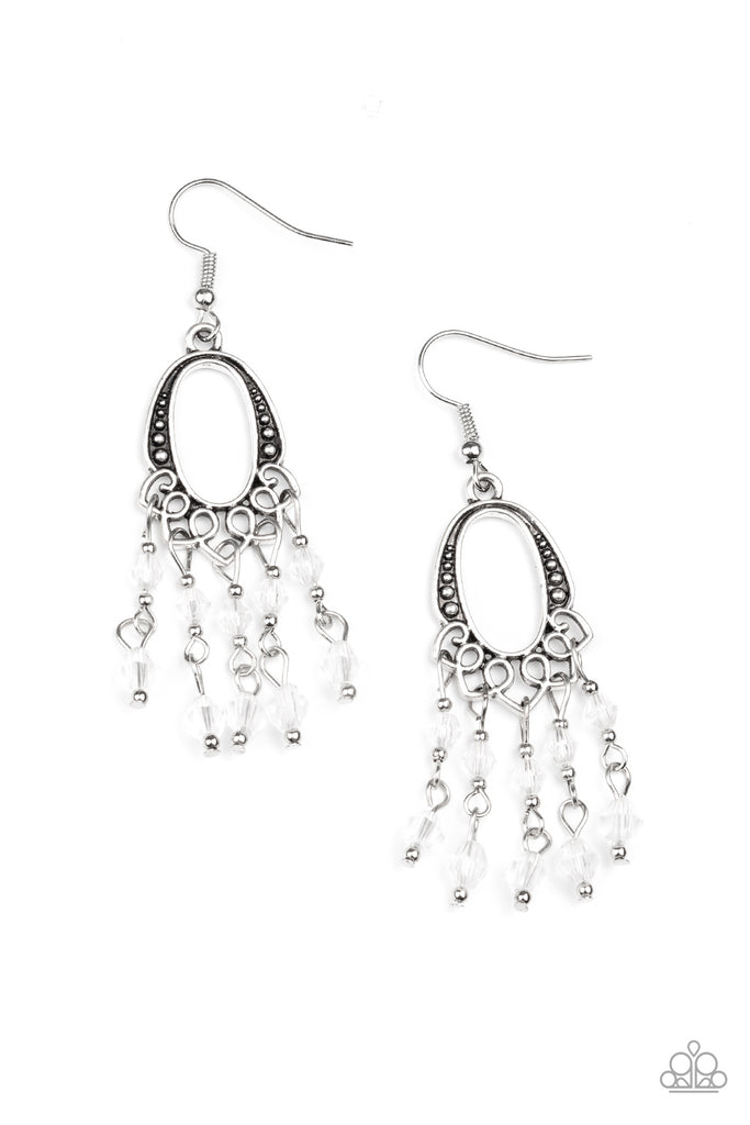 Glassy white beads cascade from the bottom of an ornate silver frame, creating a whimsical chandelier. Earring attaches to a standard fishhook fitting.