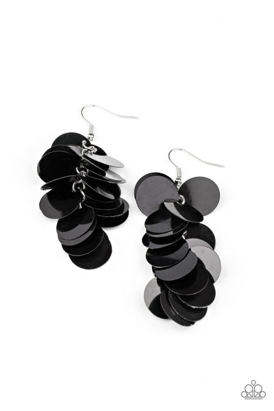 A cluster of bubbly black sequins dangle from the ear, creating effortless effervescence. Earring attaches to a standard fishhook fitting.