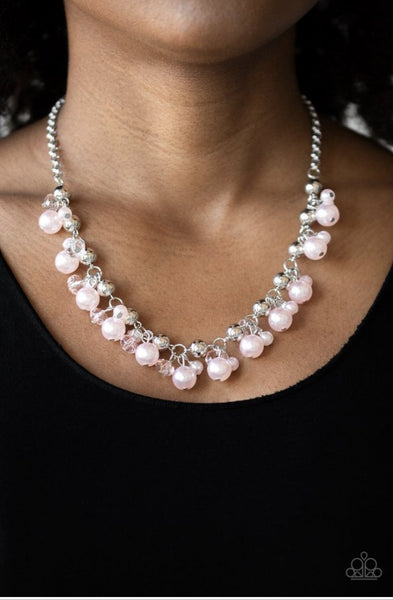 Duchess Royale Pink Necklace: A refined collection of silver beads, pink pearls, and pink crystal-like beads cluster below the collar, creating a timeless fringe. Features an adjustable clasp c