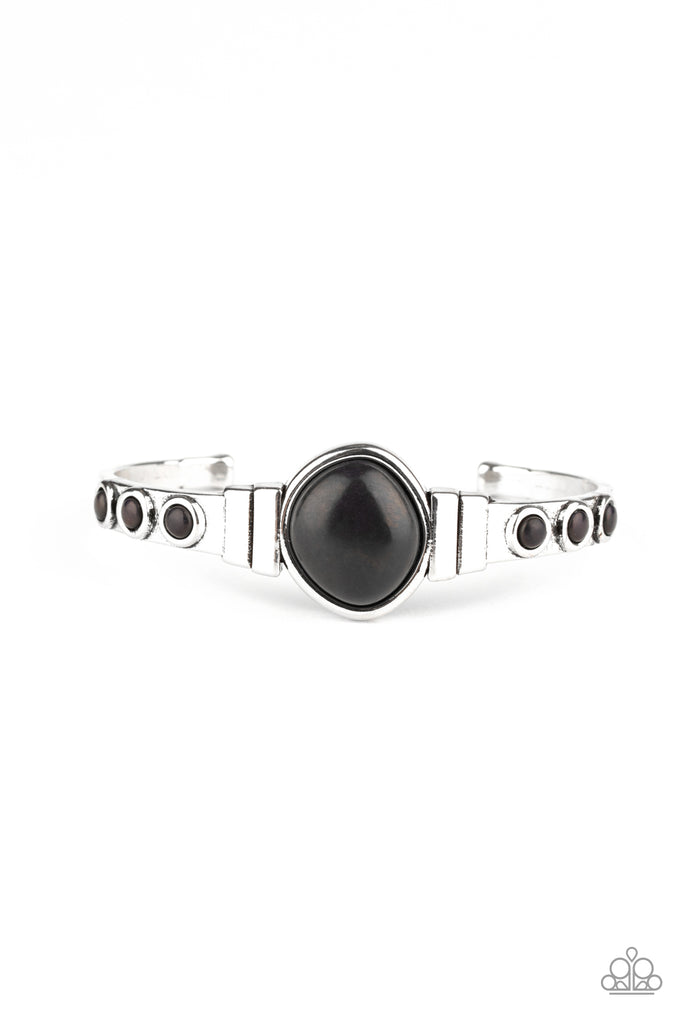 Dotted in dainty black stones, a dainty silver cuff attaches to an asymmetrical black stone centerpiece for an earthy flair.