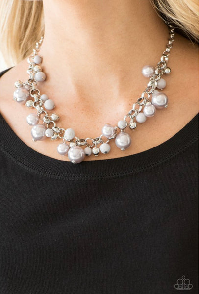 Varying in size, bubbly silver pearls, classic silver beads, and shiny gray beads swing from the bottom of a glistening silver chain, creating a refined fringe below the collar. Features an adjustable clasp closure.