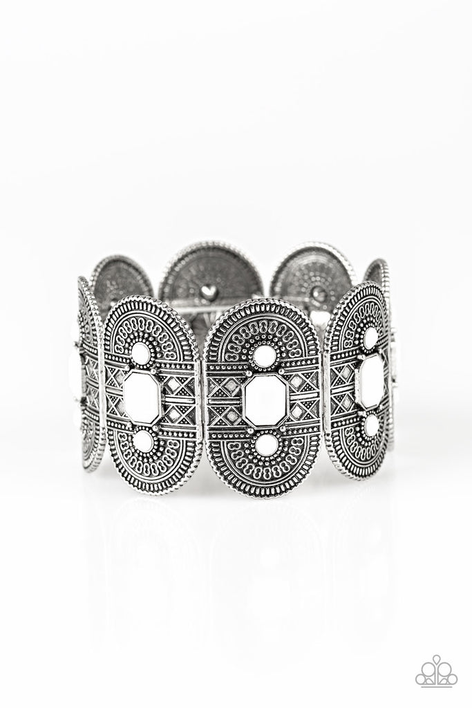Faceted white beads are pressed into rounded silver frames radiating with tribal inspired textures. The ornate frames are threaded along stretchy bands around the wrist for a seasonal fashion.