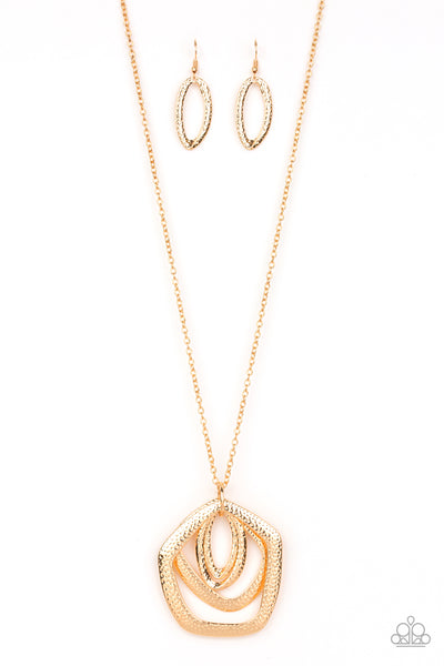 A collection of hammered geometric frames swing from the bottom of a lengthened gold chain, creating a bold artisan inspired pendant. Features an adjustable clasp closure.