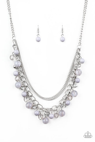 Infused with layers of mismatched silver chains, glassy, polished gray, and glittery white rhinestones swing from the bottom of a bold silver chain, creating a bubbly fringe below the collar. Features an adjustable clasp closure.