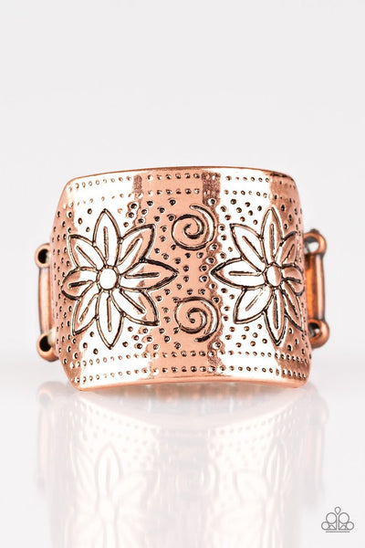 Stamped in floral detail, a thick copper band arcs across the finger for a seasonal look. Features a stretchy band for a flexible fit.