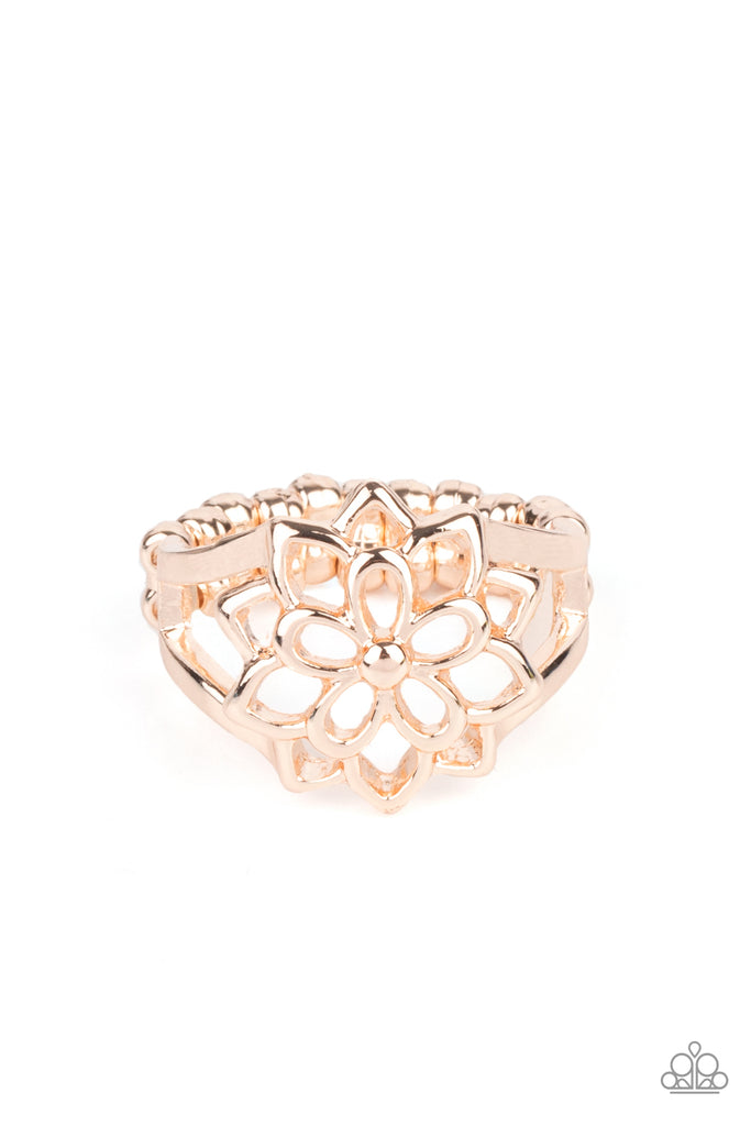 A bloom of rose gold petals layer one over the other with the gentle reminder to breathe deep and tap into your inner goddess. Features a dainty stretchy band for a flexible fit.