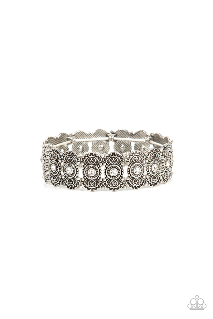 Dotted with sparkly white rhinestones, pairs of studded and heart embossed patterned silver frames are threaded along stretchy bands around the wrist for a romantic fashion.