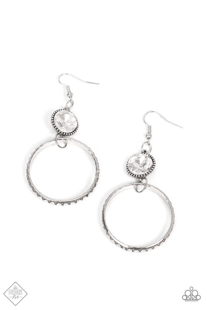 The outer edge of a silver ring is stamped with a flattened dot motif as it swings below a dramatic white rhinestone that sparkles inside a daintily dotted antiqued silver frame, creating an upscale, edgy modern lure. Earring attaches to a standard fishhook fitting.