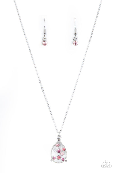 An illusion of dainty pink rhinestones collect inside a faceted white teardrop gem, creating a glittery pendant below the collar. Features an adjustable clasp closure.