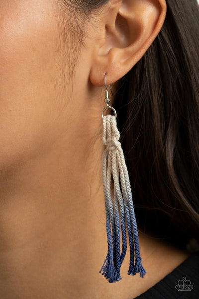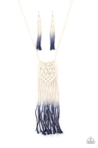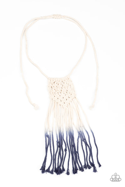 Gradually fading from white to Blue Depths, strands of twine-like cording delicately knot in braid into a decorative macramé inspired pendant across the chest. Features an adjustable sliding knot closure.